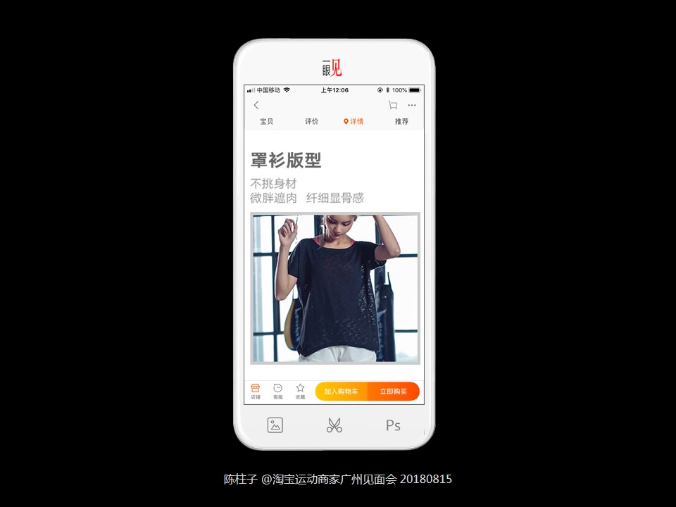 23)这屏图片和文字,是否在刚才那一屏之中?(这次有50%的人说是,大笑)。这次优化用了大图大字、一屏一主题,而且对文字量做了简化,就是为就是为了让用户在2秒钟之内,能抓到“罩衫版型”着个点,其他都删掉了。少就是多,多可能是干扰。